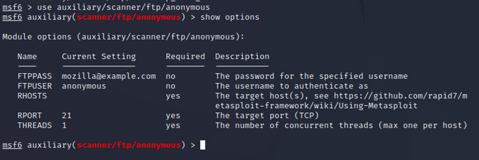 2. msf6 > use auxiliary/scanner/ftp/anonymous 를 실행합니다. 최상단에 있습니다.