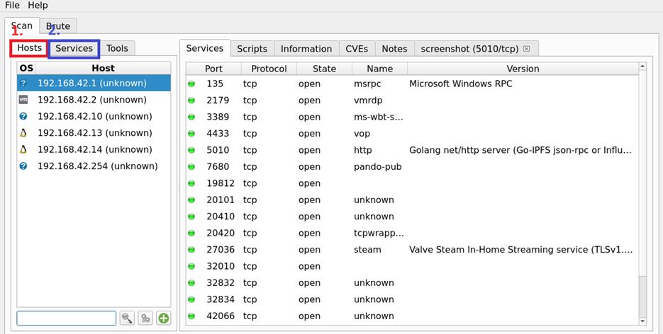 3-2. 2번 Services는 각 호스트들에서 어떤 서비스들이 실행되는지 아이피별로, 포트별로 확인이 가능합니다. 이 서비스 버전이 표시되는 것 자체가 취약점들입니다.
